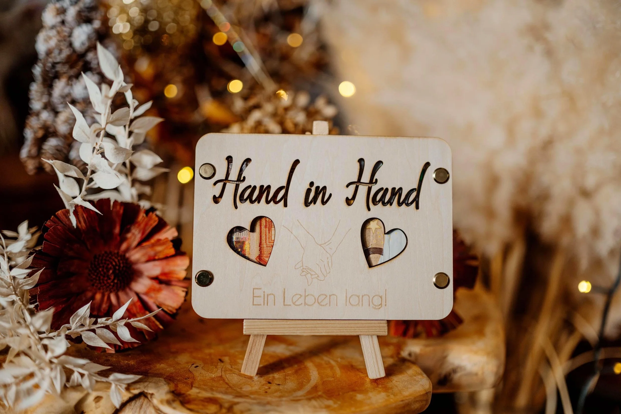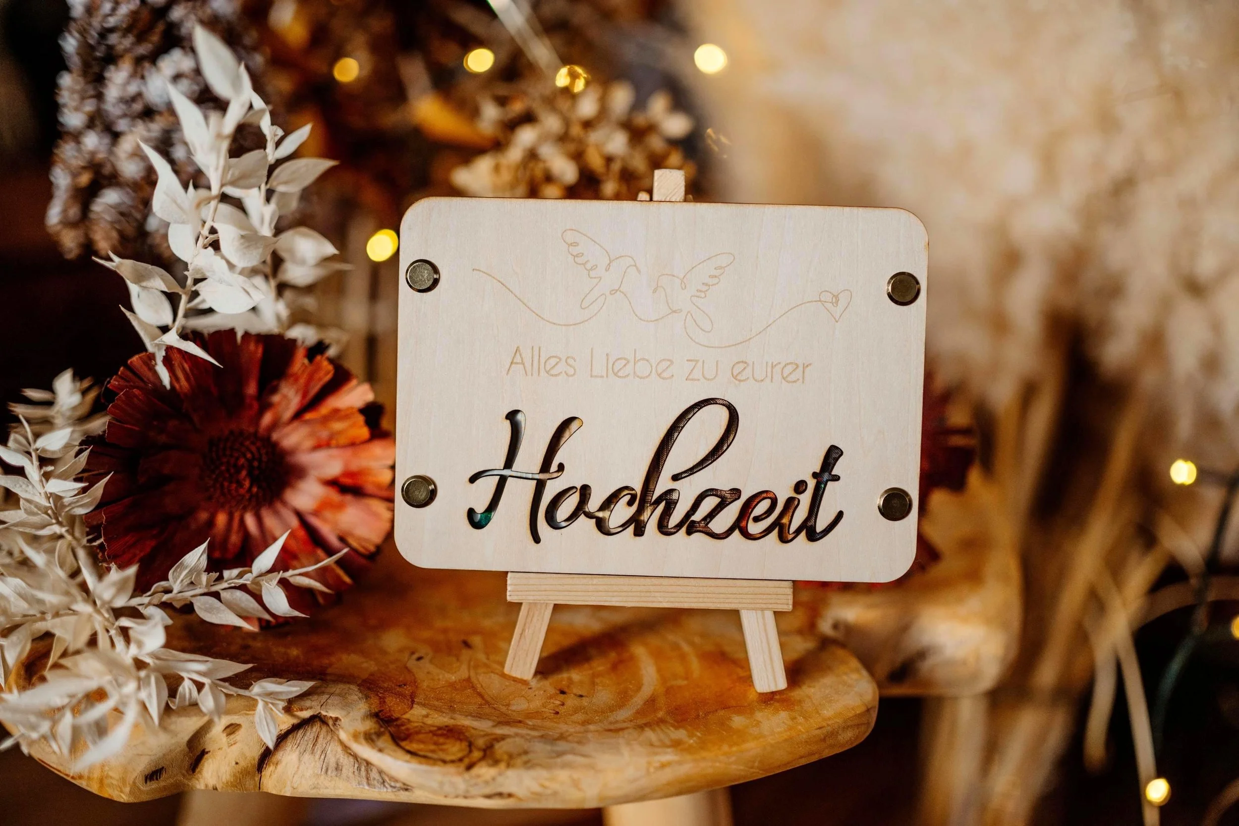 1 Holzschild, auf dem ein Symbol Deiner Wahl befestigt ist. Es ist ein Platzhalter eingebaut, sodass der Geldschein perfekt hinter dem jeweiligen Symbol hineingesteckt werden kann und sicher verstaut werden kann.