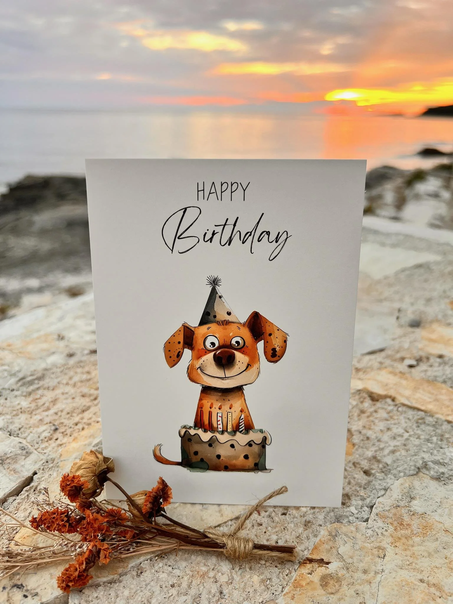 Geburtstagskarte "Happy Birthday" mit süßem Hundemotiv vor einer Geburtstagstorte / Aquarell Illustration / Kindergeburtstag / Alles Gute