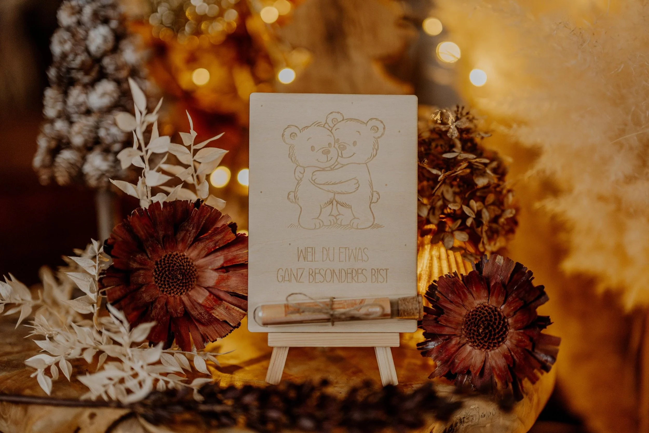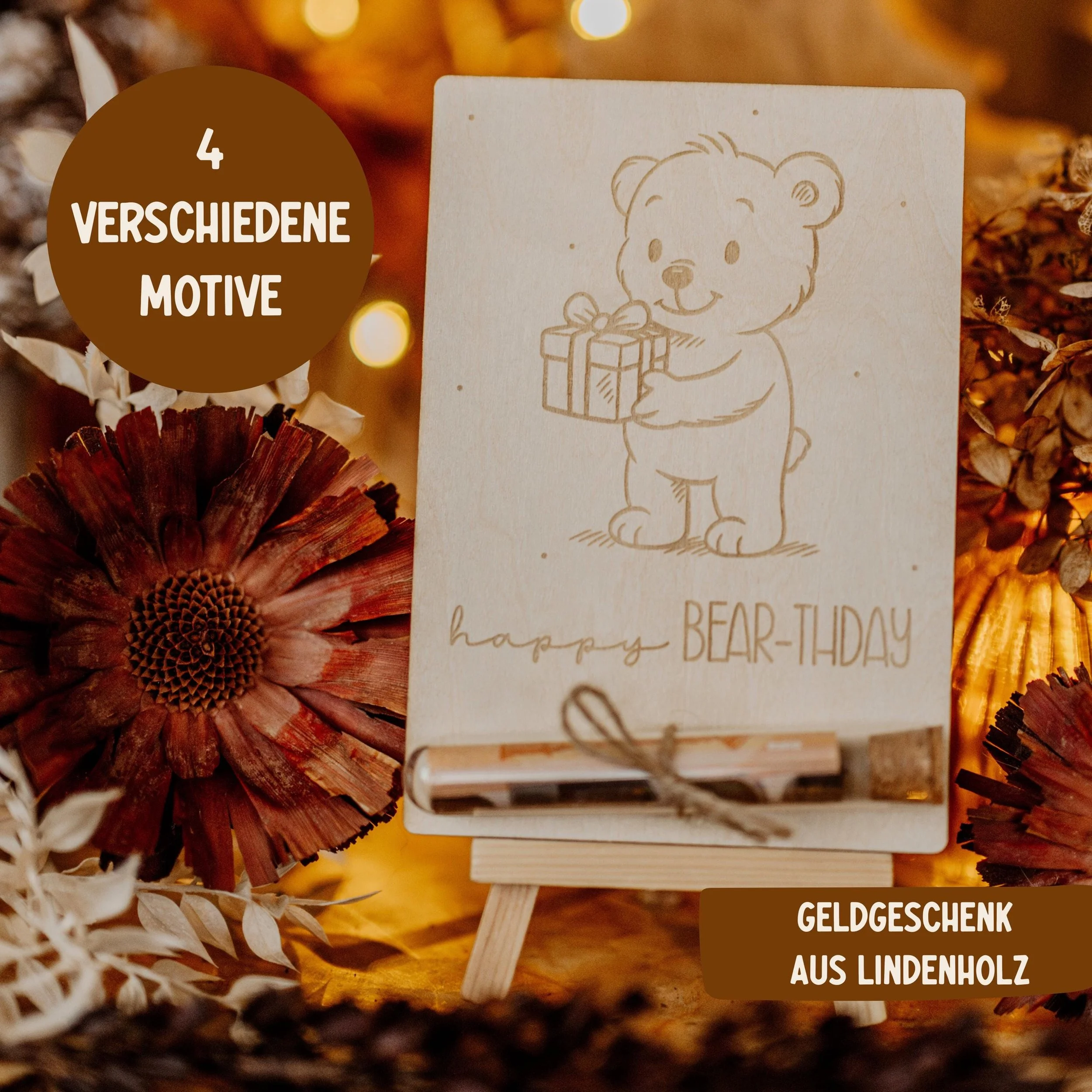 🎁 Geldgeschenk aus Holz mit Bärchen – 4 Motive | Wahlweise mit Reagenzglas | Personalisierbar | 10,5 × 14,8 cm