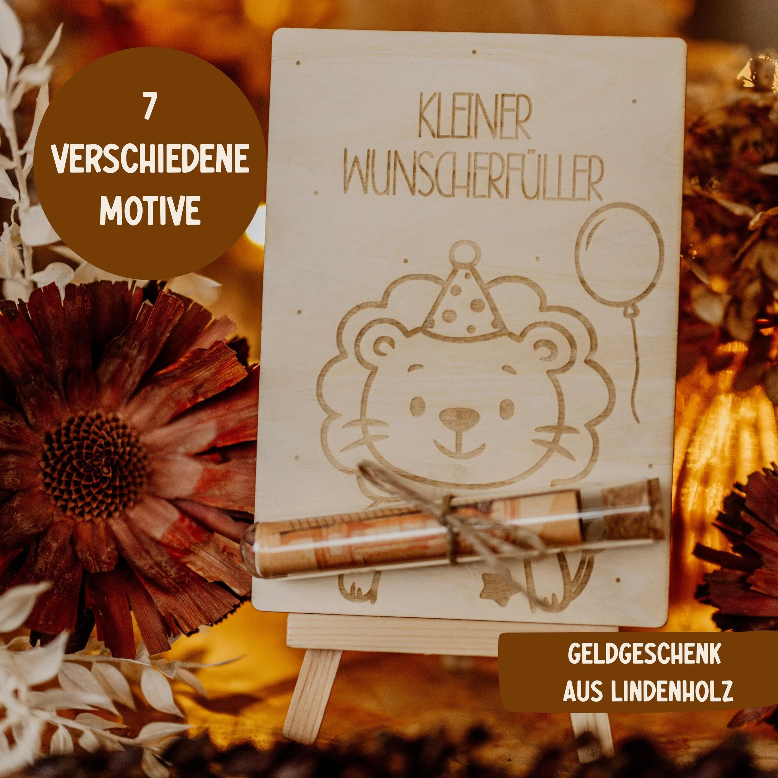 🎁 Geldgeschenk aus Holz mit Tiermotiv – 7 Varianten | Wahlweise mit Reagenzglas | 10,5 × 14,8 cm