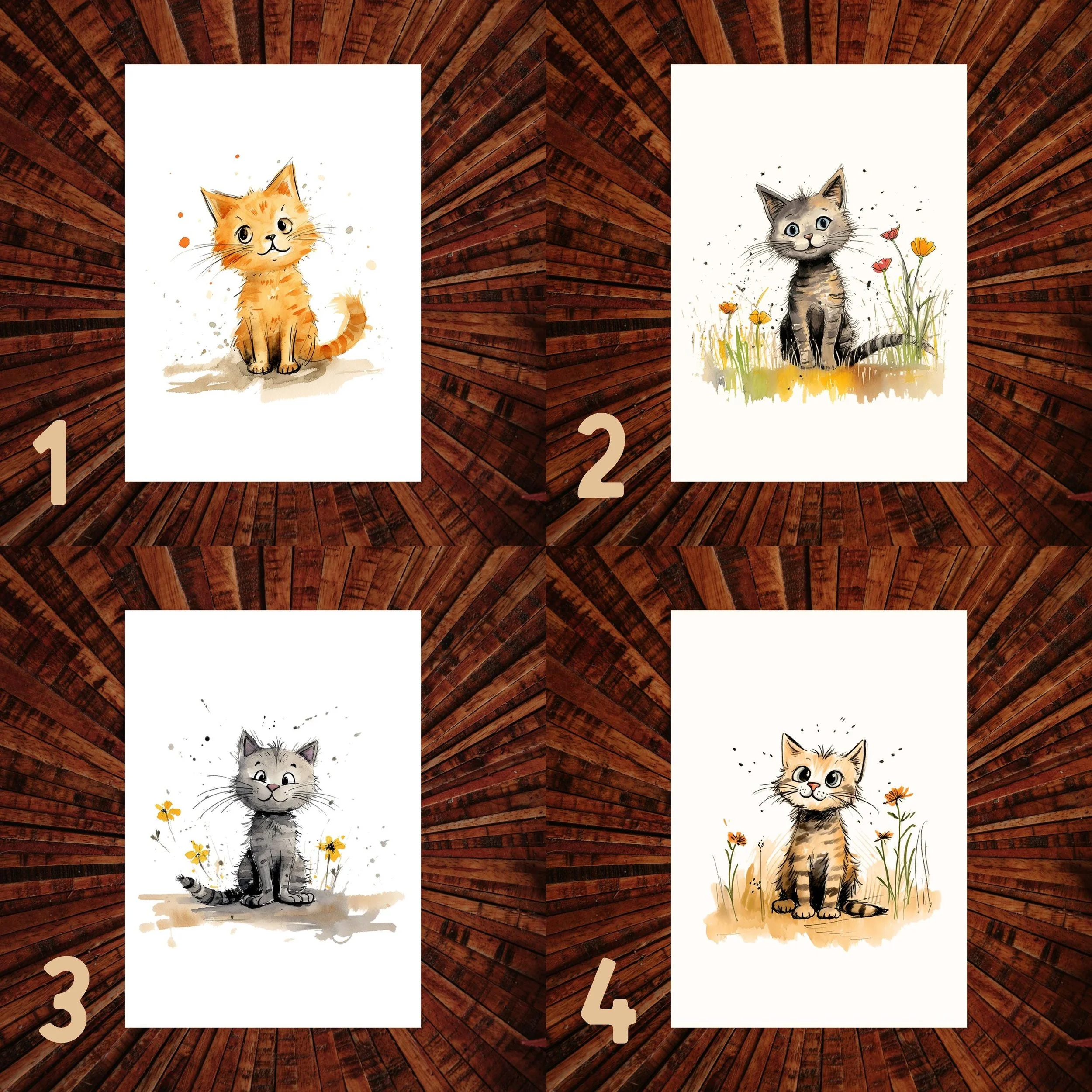 Postkarte für Tierliebhaber mit süßen Katzenmotiven in schönen und kräftigen Farben. Aquarell Illustration.