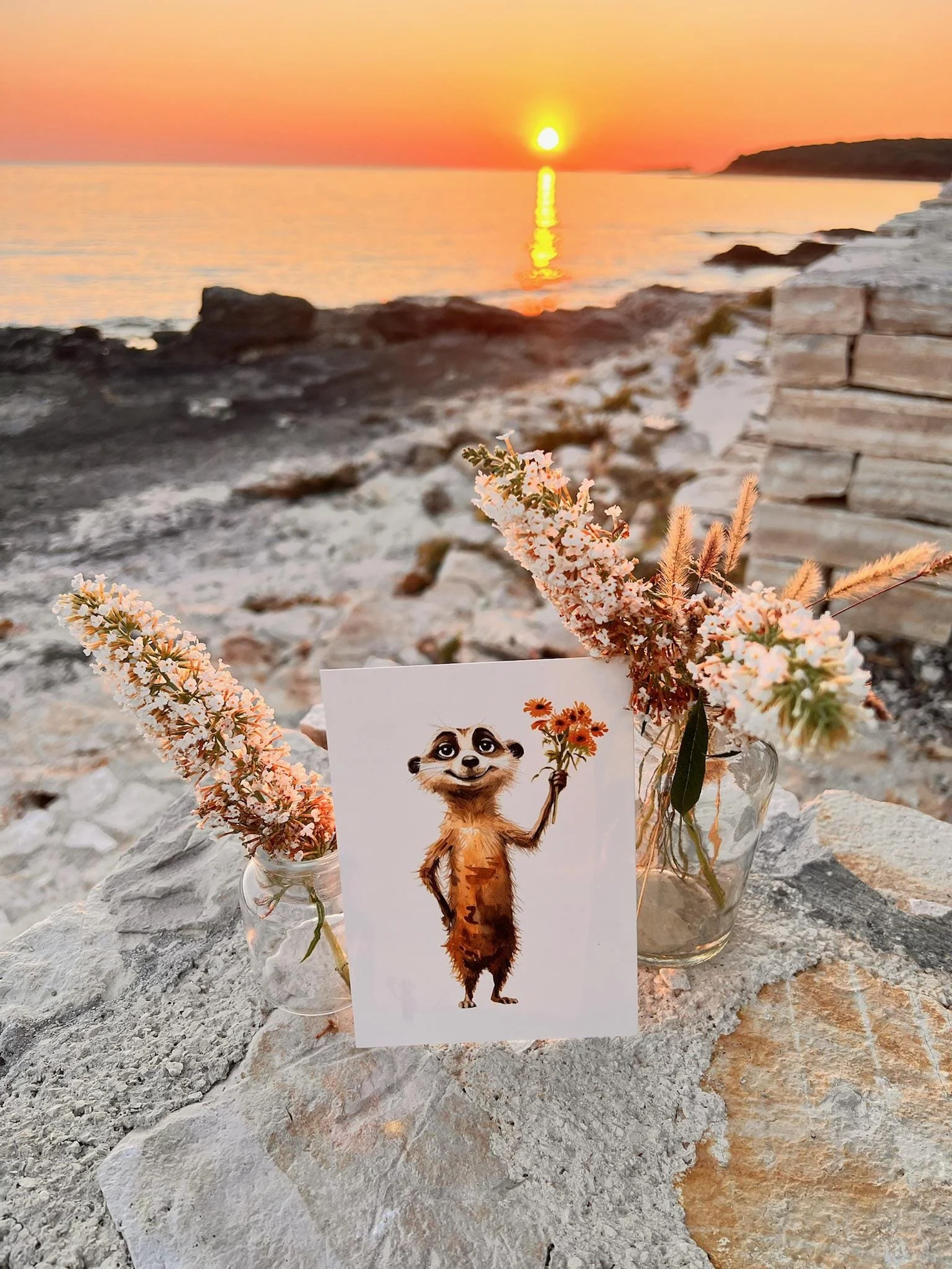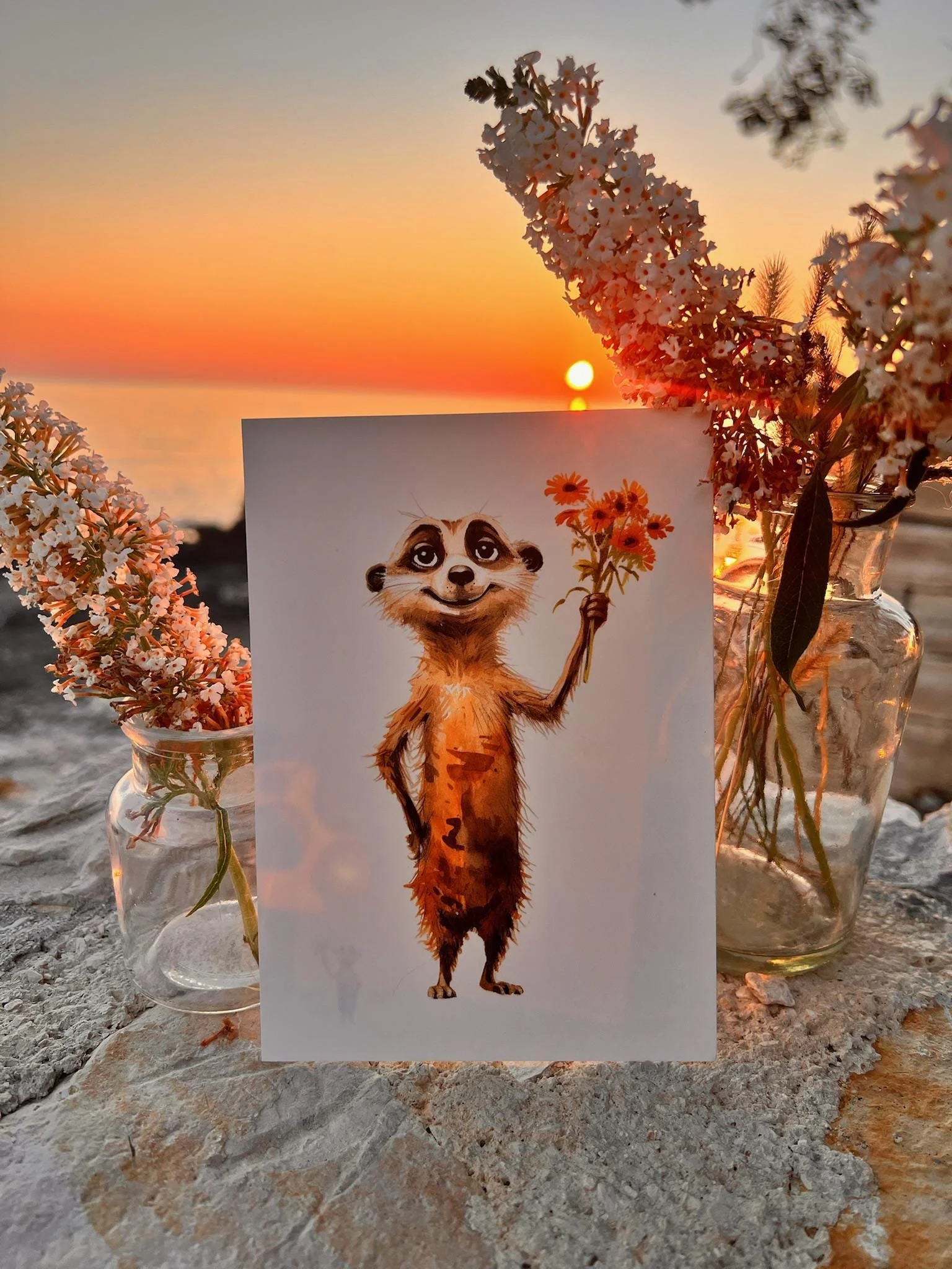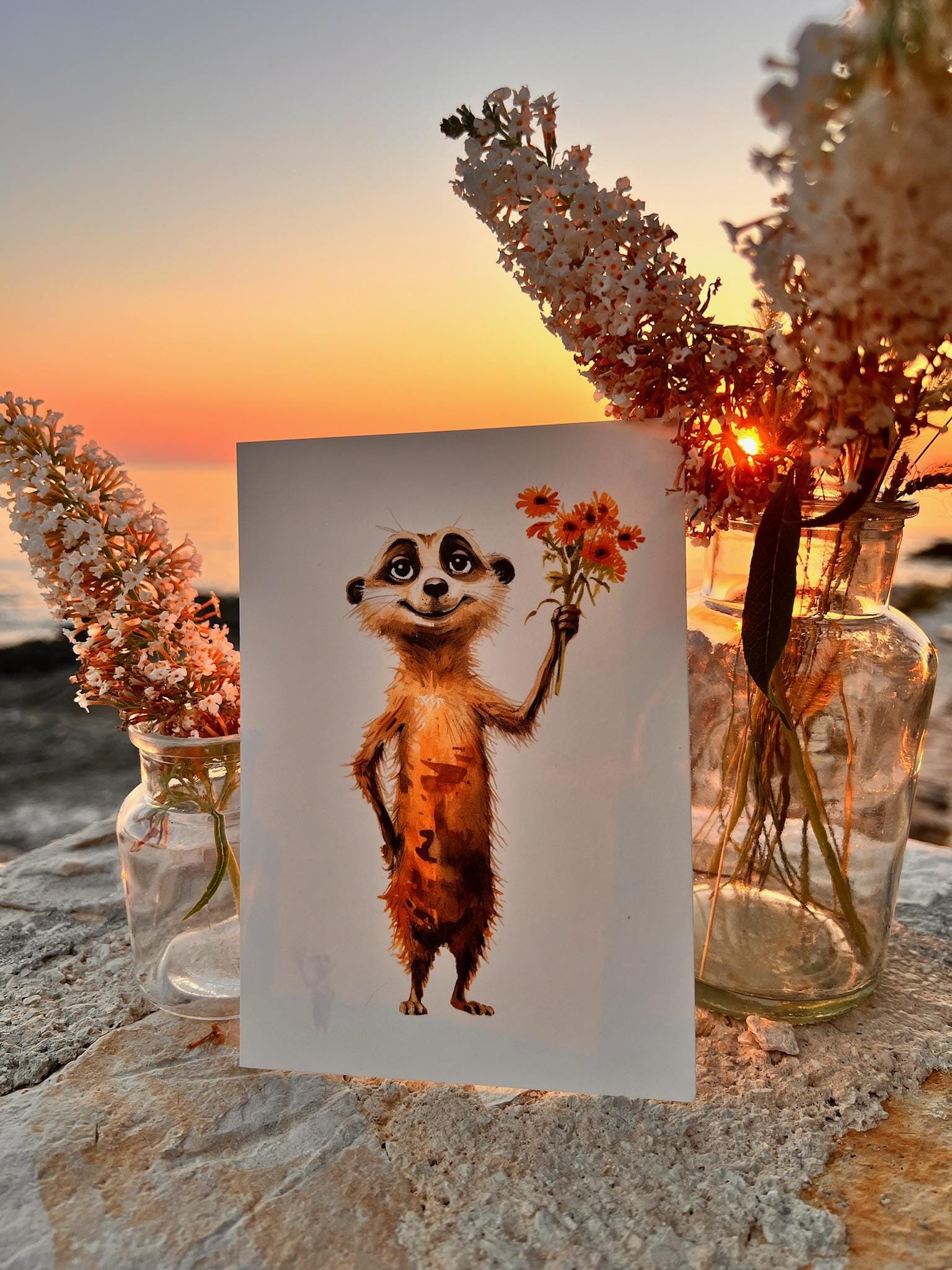 Diese liebevoll gestaltete Postkarte zeigt ein niedliches Erdmännchen mit einem Blumenstrauß – umgesetzt als zarte Aquarell-Illustration. Gedruckt wird auf hochwertigem, cremefarbenem Naturkarton (300 g), FSC-zertifiziert und angenehm stabil in der Hand 🌿✨.